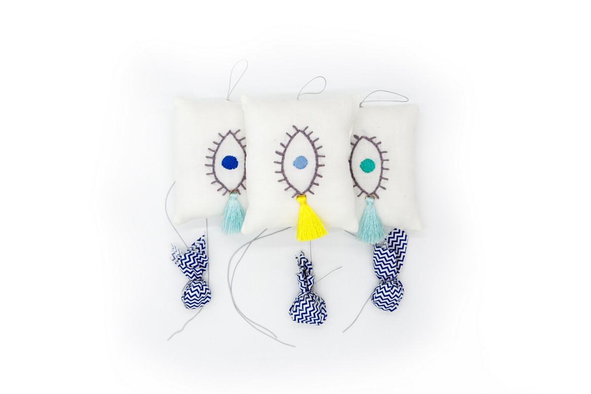 Hand emproidered with evileye in linen cushion with tassel and fabric pouch containing sugar dragees