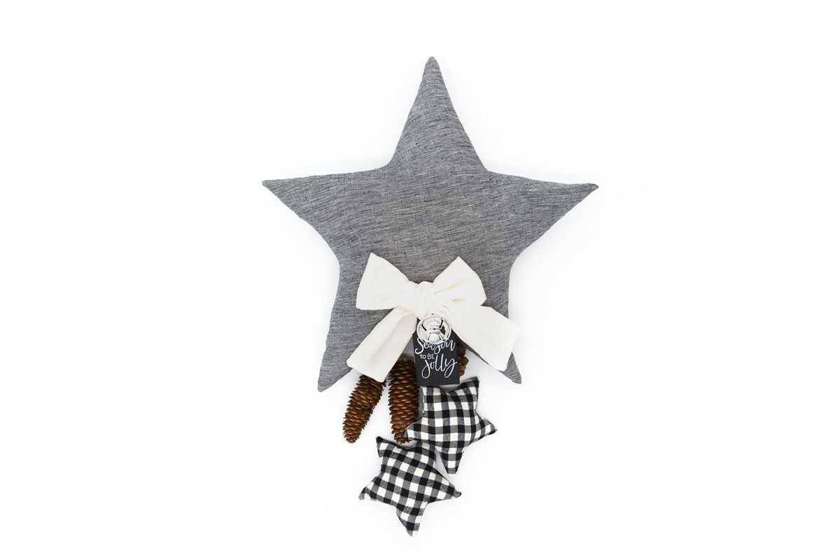 Αστέρι μεγάλο γκρί 48 εκ με φιόγκο,κουδουνάκι και πινακάκι με χριστουγεννιάτικο μήνυμα βγαίνει σε διάφορα καρό και βελουδο με κουκουνάρια και αστεράκια