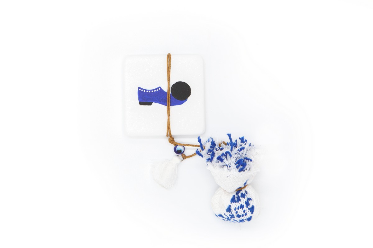 Μπομπονιέρα μαρμαράκι με τσαρούχι ζωγραφισμένο στο χέρι ,δεμένο με υφαντό και ματάκι