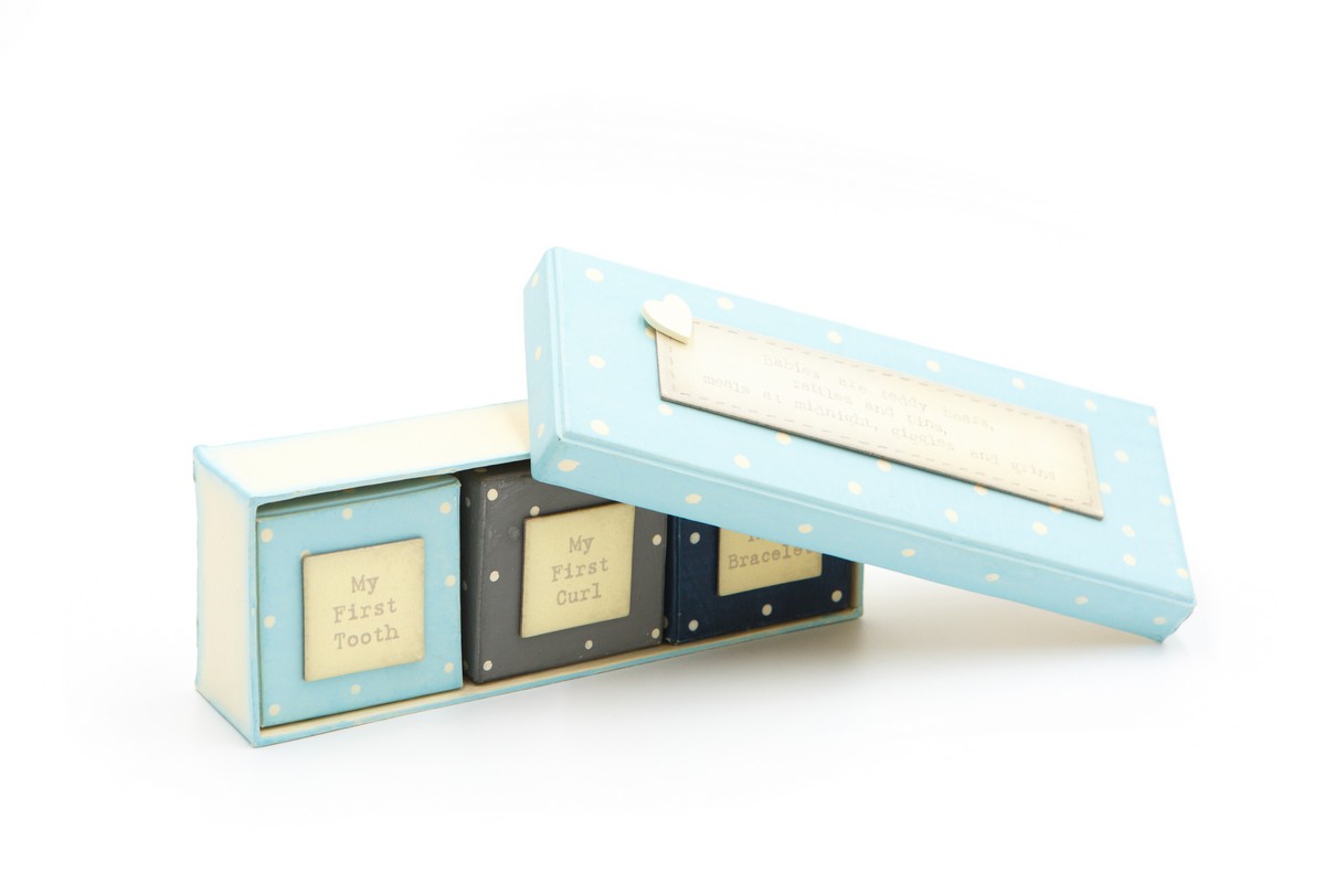 Σετ για νεογέννητο αγόρι σε σιελ, που περιέχει 3 κουτάκια για το μπρασελε από το μαιευτήριο ,την πρώτη του μπούκλα ,και το πρώτο του δοντάκι