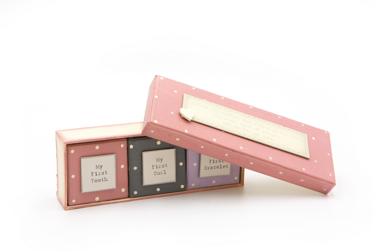 Σετ για νεογέννητο κορίτσι που περιέχει 3 κουτάκια μικρά για την πρώτη του μπούκλα το μπρασελέ απο το μαιευτήριο και το πρώτο του διντάκι